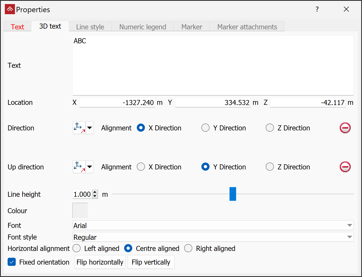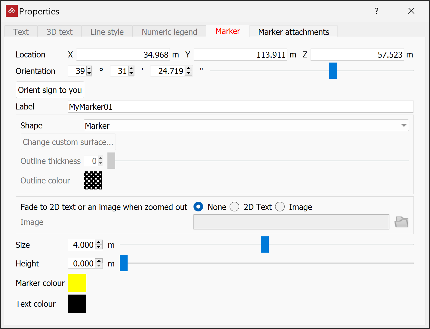Orientation: Adjust the marker’s orientation by entering an angle or dragging the slider. Click Orient sign to you to rotate the marker perpendicular to the current view direction.