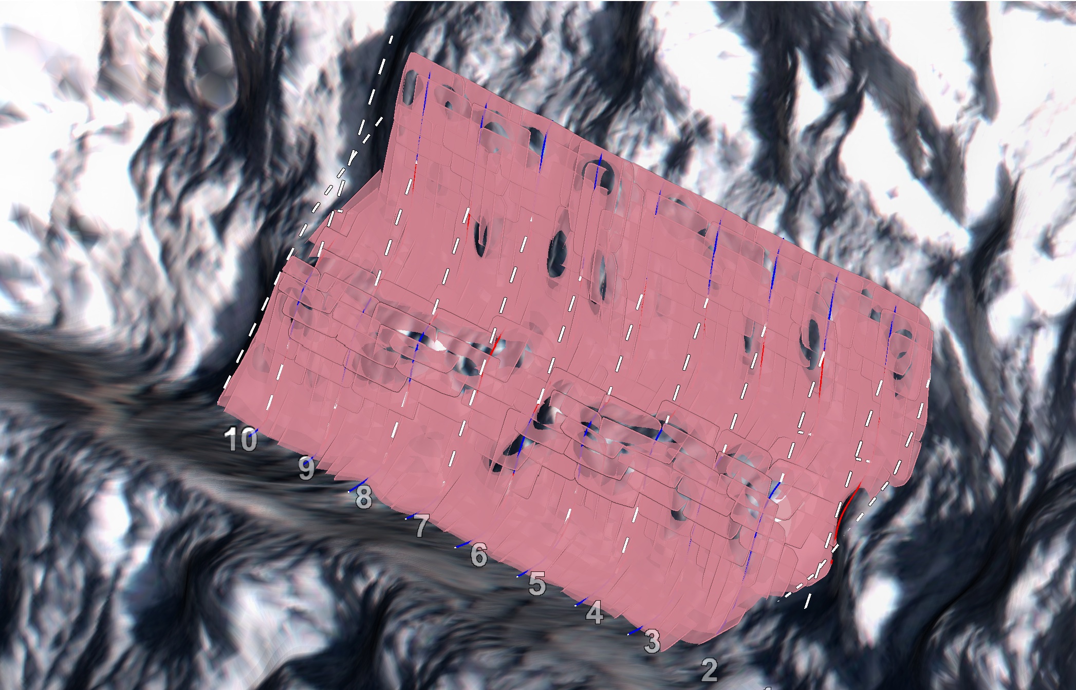Waviness in discontinuity analyses results from repeating features of flat and steeper areas perpendicular to the slope in the dip direction (forming a wavy pattern), and effectively providing greater resistance to sliding than a completely flat, steep face. The Query Waviness tool (Geotechnical tab > Analyse group) provides a means of examining and quantifying the roughness of a section of discontinuity. The process involves subdividing the section into patches of nominated sizes for a statistical analysis of waviness along a plunge and trend. A series of cross sections through the region helps to visualise and identify any wave-like patterns. The results can be saved in a PDF document.