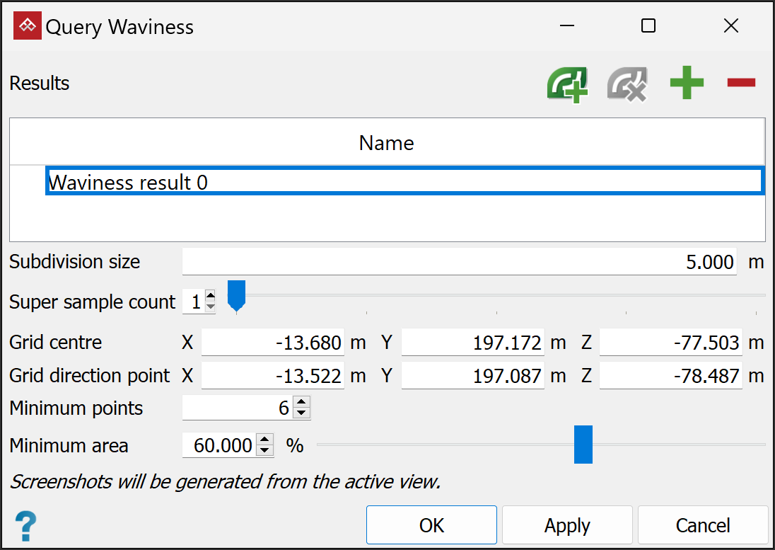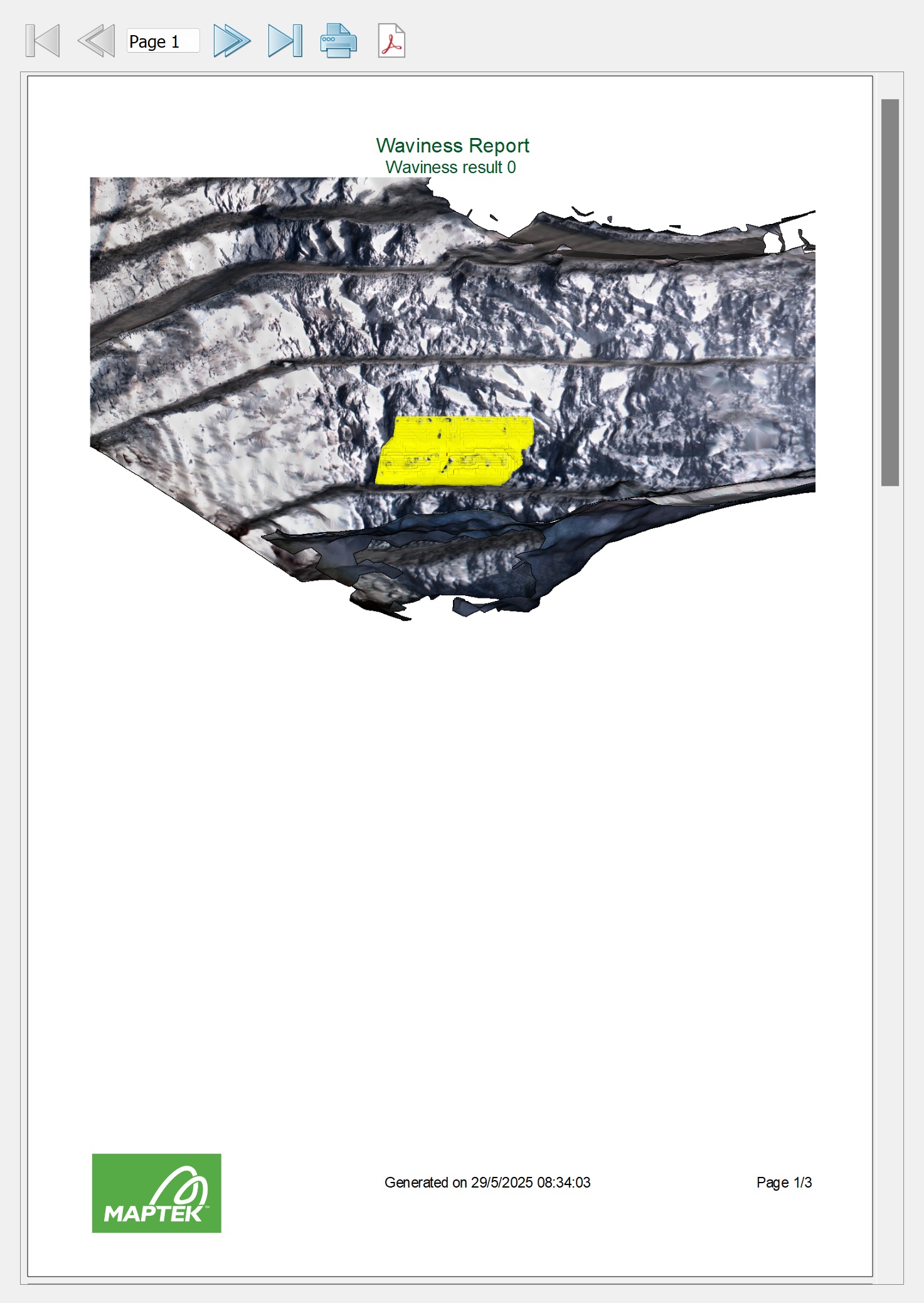 When you have all required areas analysed, click Apply or OK to create waviness reports as PDF documents. Otherwise click Cancel to exit without creating PDF reports.