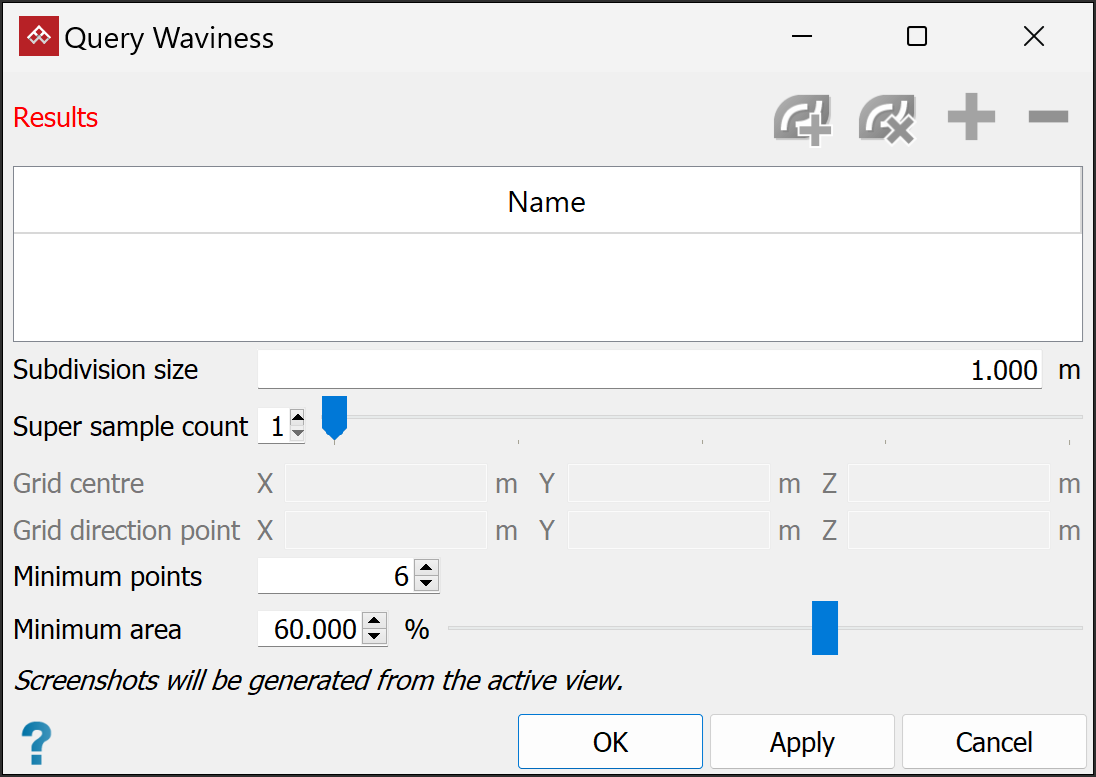 Subdivision size Nominate an appropriate size to divide the area into suitable patches for analysis. The smaller the size, the more sensitive the analysis. Super sample count A method to further refine analyses over the area. Extra subdivision patches are offset between the initial patches providing extra data. Grid centre and Grid direction point These identify the direction of slip and are usually auto-populated for a standard planar sliding case. For a wedge case, you can manipulate the line to coincide with the wedge centre line, which represents the direction of probable slip for a wedge block. Minimum points This figure specifies the minimum number of points required to make the individual plane in the patch. Otherwise the patch is ignored. Minimum area This figure specifies the minimum percentage of area required to make the individual (discontinuity) plane in the patch. Otherwise, if the resultant patch is smaller than this percentage, it is ignored. -