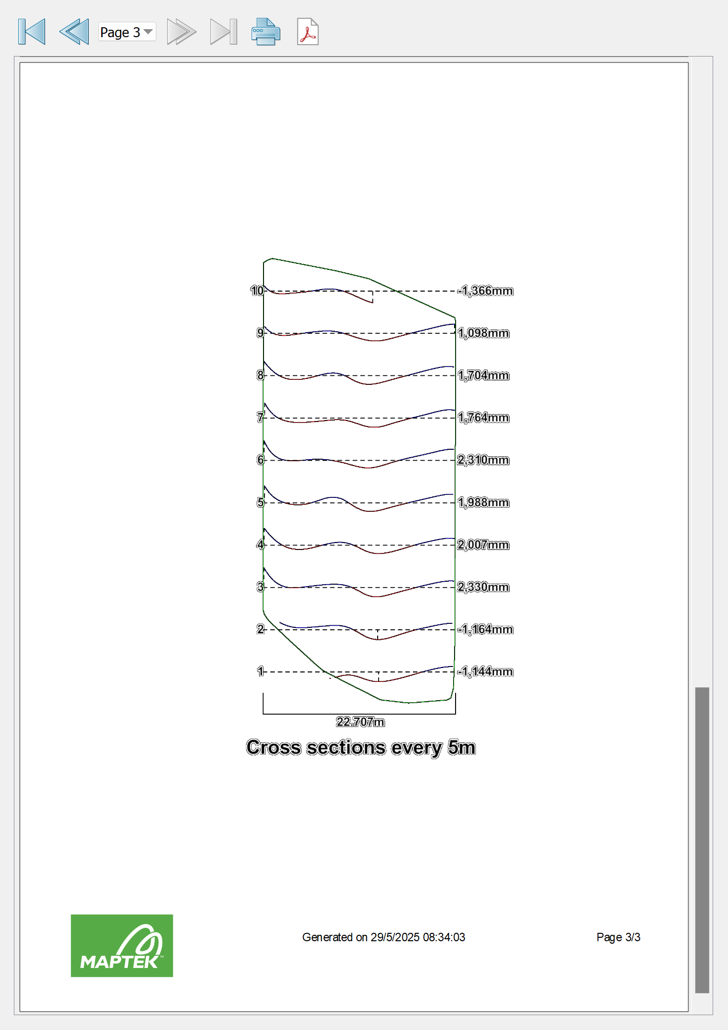 The third page displays cross-sections that are taken vertically through the face, then plotted graphically in sequence from the original right (top) to left (bottom). The cross-sections are spaced according to the subdivision size. Cross-section line colours indicate whether a line is above (blue) or below (red) the mean for that section, while the numbers on the right-hand vertical axis indicate the maximum deviation from the mean. The number on the horizontal axis is the maximum cross-section length.