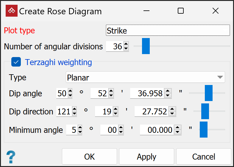 Set the Minimum angle as the lowest angle between the measurement orientation and the discontinuity that may be used for weighting.