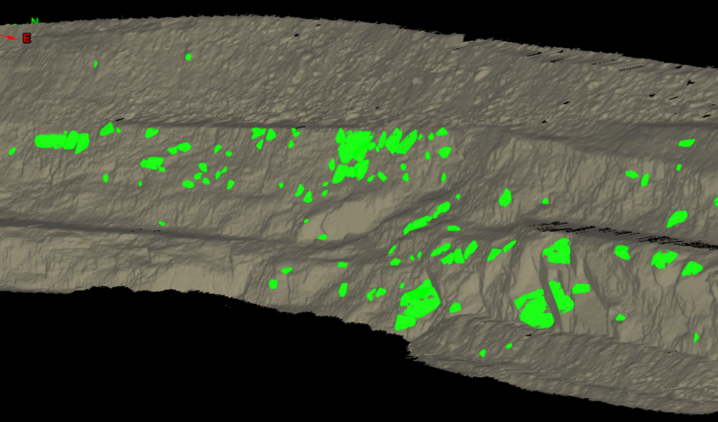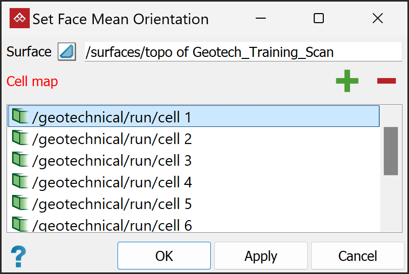 This tool uses the section of pit face or wall contained within a cell to calculate a mean face orientation. The mean orientation value is then assigned to the cell. This quantity and others can be retrieved using the cell map report tool. See Cell map report.