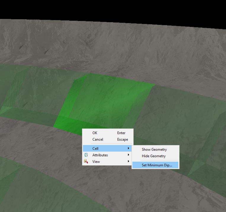 This tool allows you to set a minimum dip value for a cell. You can enter values or select three points on the pit wall or surface that represent the plane of the minimum dip value. This quantity and others can be retrieved using the cell map report tool.