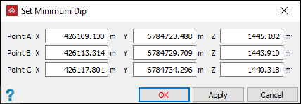A panel will open with fields for the coordinates of three points. Enter coordinates or select each field and pick the part of the pit surface you want to use to define the plane of minimum dip.