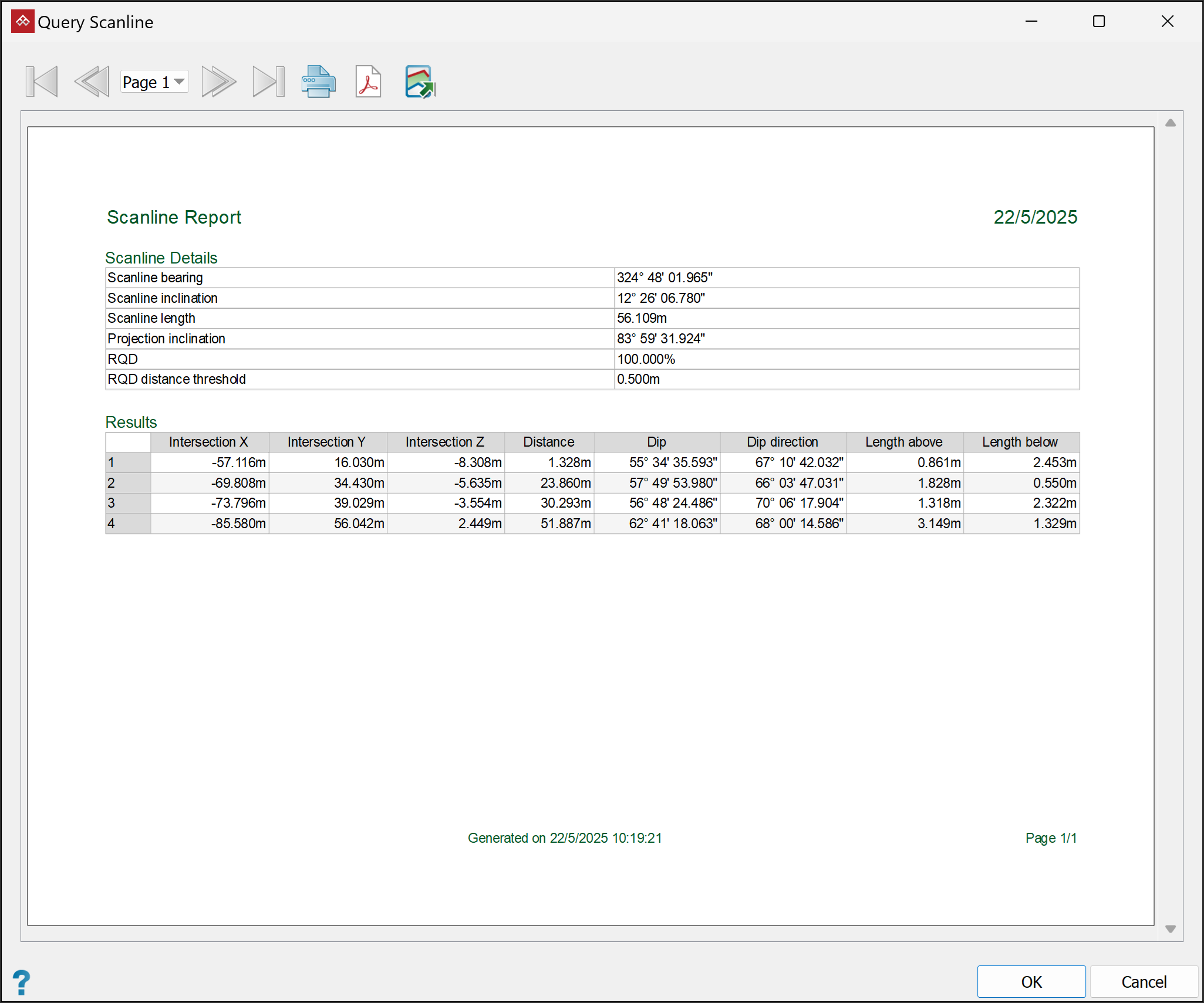 The scanline query tool will produce and display a results report containing details of each discontinuity, including intersection coordinates and distances, dip angle and direction, lengths above and below the scanline, and any attributes defined in PointModeller Preferences. See Preferences > Discontinuity Attributes.