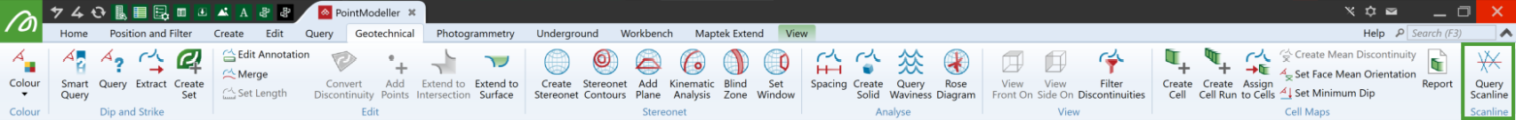 The Scanline tool on the Geotechnical tab enables you to report on discontinuities along a scanline on a rock face.