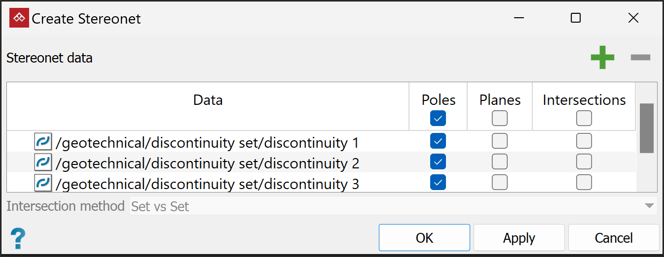 Set vs Set: The stereonet tool will generate intersections between discontinuities from different sets, but not between discontinuities in the same set.