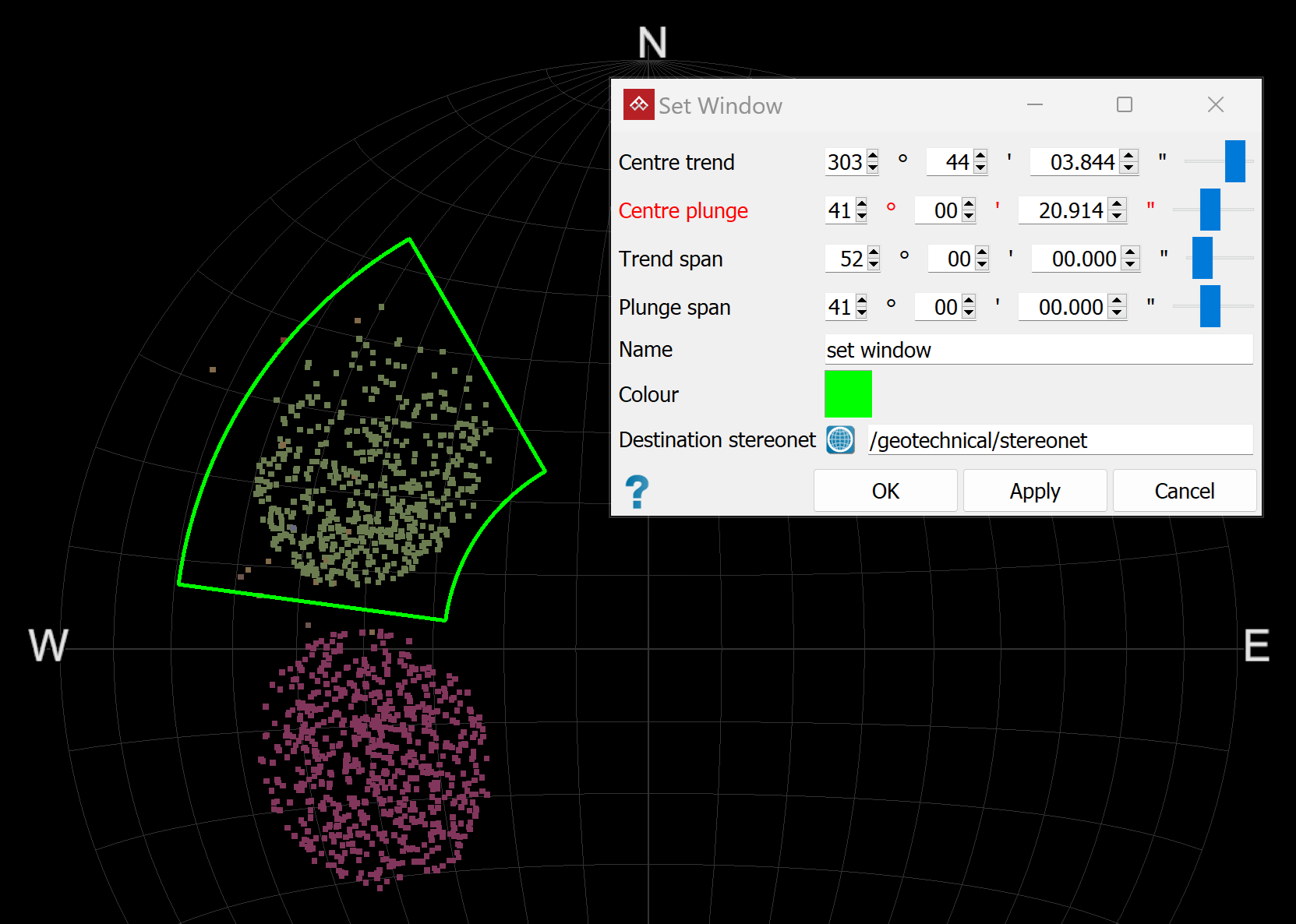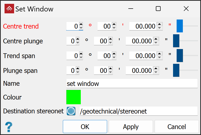 Set Window.The Set Window panel will open with all angle fields either set to zero if no discontinuity set has been selected, or pre-populated based on the selected discontinuity sets.