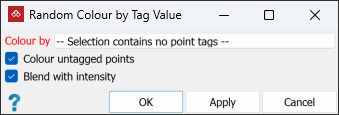 Random Colour by Tag Value... allows you to colour points differently, according to their attribute values. Each point in the selected data is coloured according to its value for the selected attribute. Untagged points may be coloured differently again.