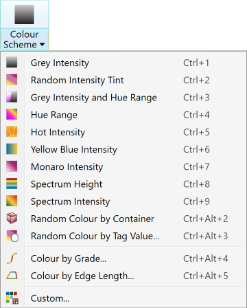 The colour schemes make use of intensity, range, or height properties to colour and shade selected objects. These schemes are particularly useful for comparing objects to highlight specific features (e.g. geological features), or for presenting a more aesthetic appearance.