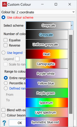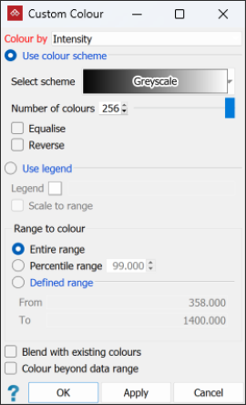Use custom colouring to apply a colour scheme to an object based on intensity, range, or height properties. This option can reproduce or reverse any of the existing colour schemes, or limit them to specific values.