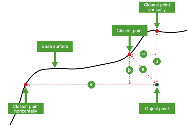 Closest vertical point to colour by the distance to the nearest base point directly above or below the selection point.