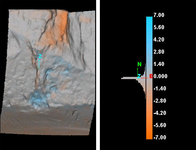 Colouring by distance is useful for comparing as-built surfaces against design models to highlight non-conformance. You can also use it to identify changes between scans of the same area, such as a slow moving failure in an open-pit mine.