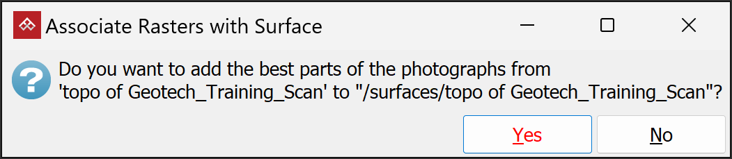 Using the remaining options in the Photographic drop-down, you can manage and modify the associated images. See Photographic > Adjust Image Colour, Associate Rasters to Surface, and Image Manager.