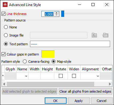 Glyphs are basic shapes that can be incorporated into the line pattern. The glyph control table provides a wide range of settings such as Width, Height, Rotate, Widen, Alignment, and Offset distance. These allow tight control on placement of the glyphs as well as behaviour in the image, such as whether the glyphs are attached to the line or can rotate freely around the line.
