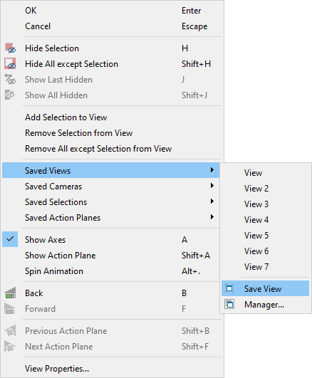 (Context menu) Right-click in the view window, hover over Saved Views, then click Save View.