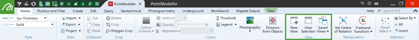 The View group on the Home tab contains quick access to tools for creating and saving views.