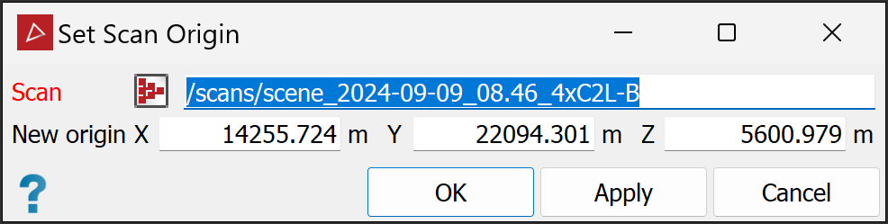 Set a scan's origin coordinates to a specific location without altering coordinates of its points. |