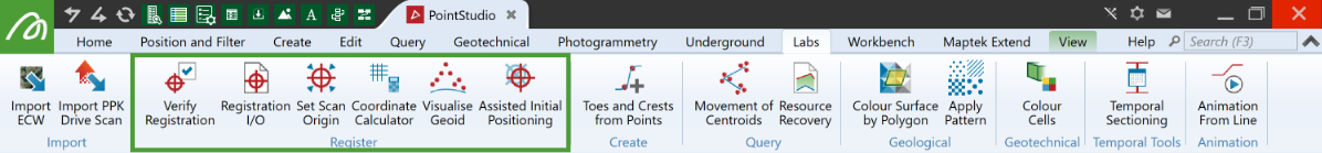 The Register group on the Labs tab provides additional tools to manage and assist with scan registration.
