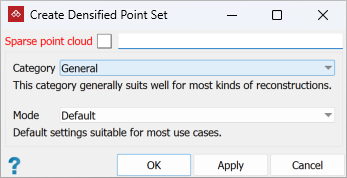 Mode Description Applicable categories Preview This mode skips densification; the sparse point cloud is treated as the dense point cloud. General, Aerial/Nadiral, Urban, Surface scan Default Default settings for most use cases. General, Aerial/Nadiral, Urban, Surface scan High details Higher resolution than the default setting. Use this setting when the Default mode result is unsatisfactory. General, Aerial/Nadiral, Urban, Surface scan, Vertical structure Ultra Fine resolution and very slow mode that should be used only in very specific cases. Surface scan, Vertical structure -