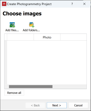 New.The Create Photogrammetry Project panel will open on the Choose images page.