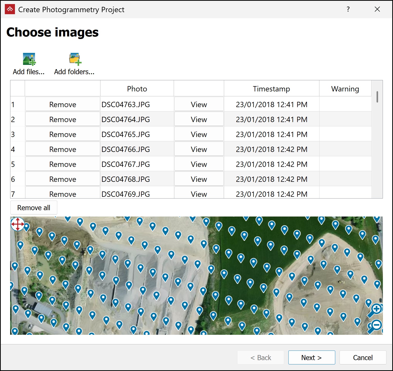 Add folders..., navigate to the parent folder, select the folders containing the images and click OK. PointModeller will import all images in the selected folders into the project.The photogrammetry project tool panel will list the image files and mark those with GPS data on a satellite image of the area.