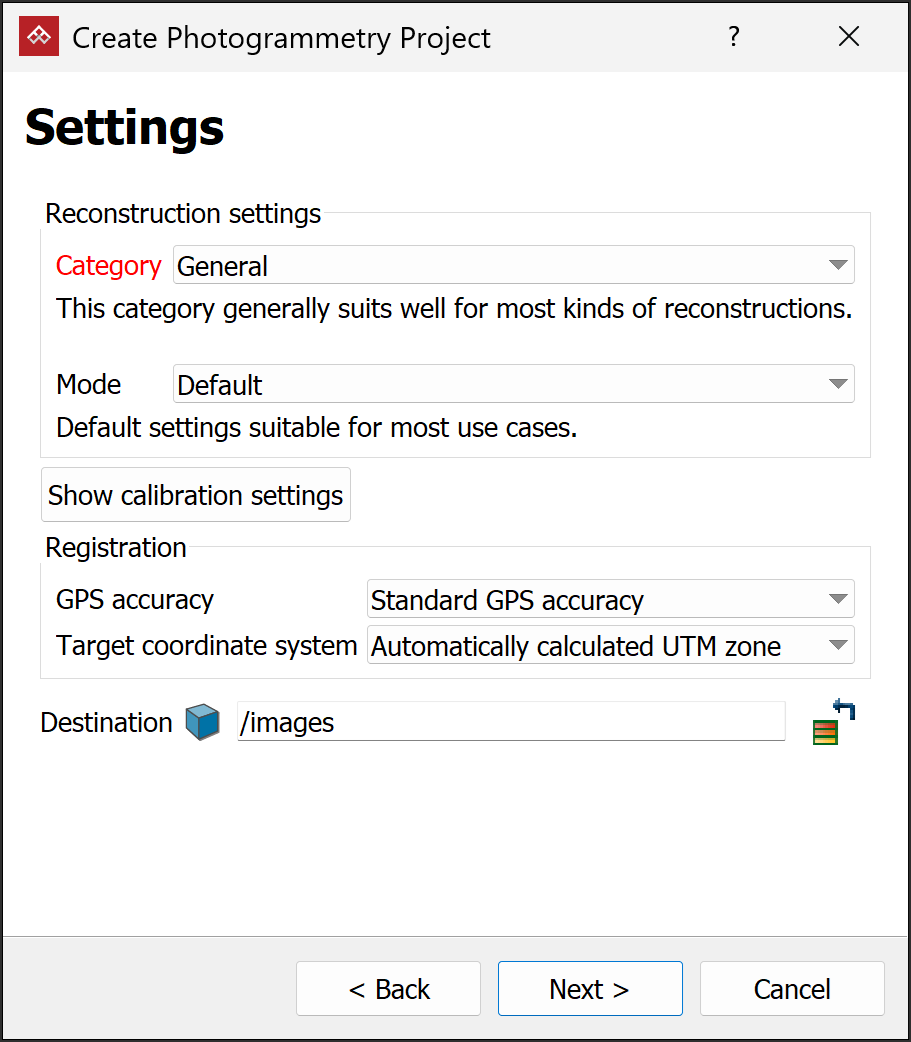 Note: If no selected images contain GPS camera positions, the Registration options will not appear.