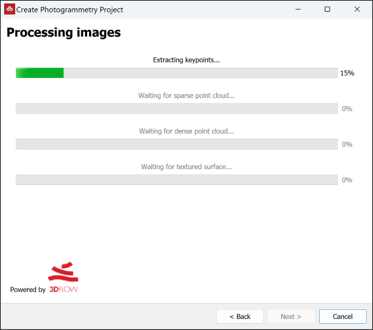 The New tool will run, generating a sparse point cloud, followed by the tools selected for batch processing.