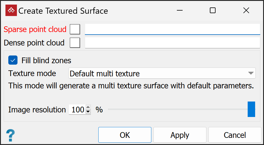 When Fill blind zones is selected, the textured surface tool will add points to fill in areas that are not visible to any cameras. Clear this option if you want these areas to remain unfilled.