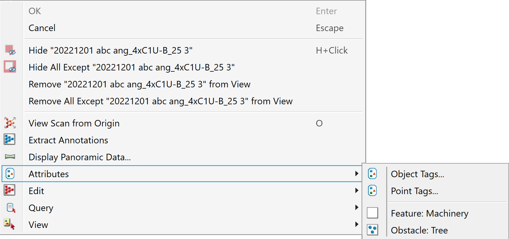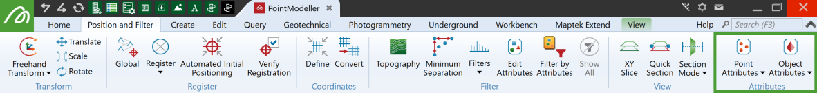 The Attributes tools on the Position and Filter tab enable you to add tags to any selection of points or objects. These can be used to improve analysis and understanding of the data by sorting data according to different characteristics.