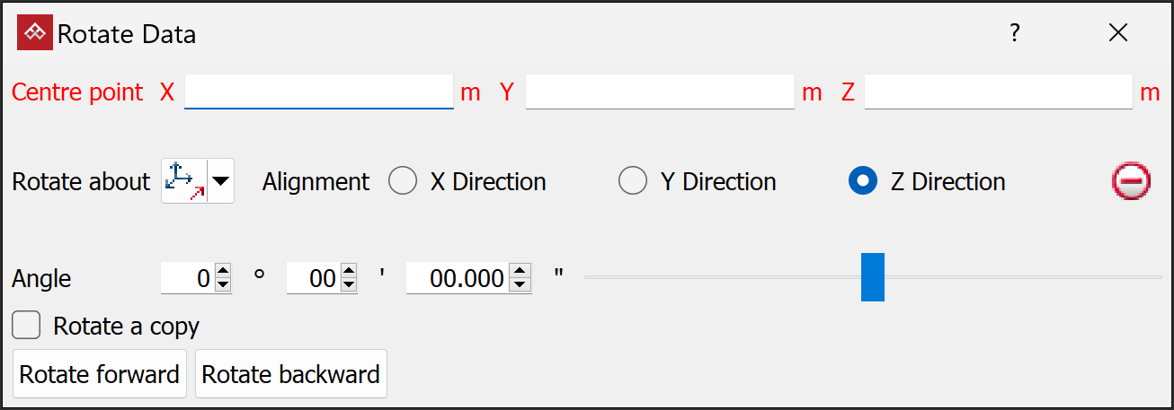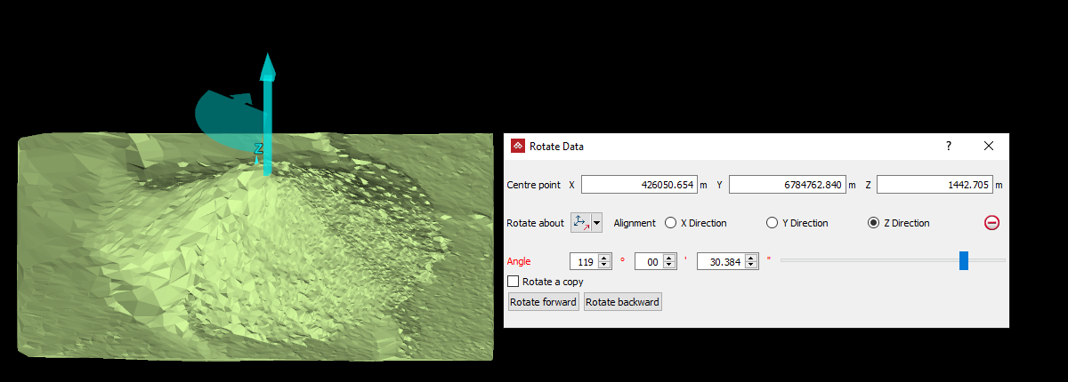 The Rotate tool (Ctrl+E) allows you to rotate data around the three axes (X, Y, Z), or around a user-defined axis, as follows: