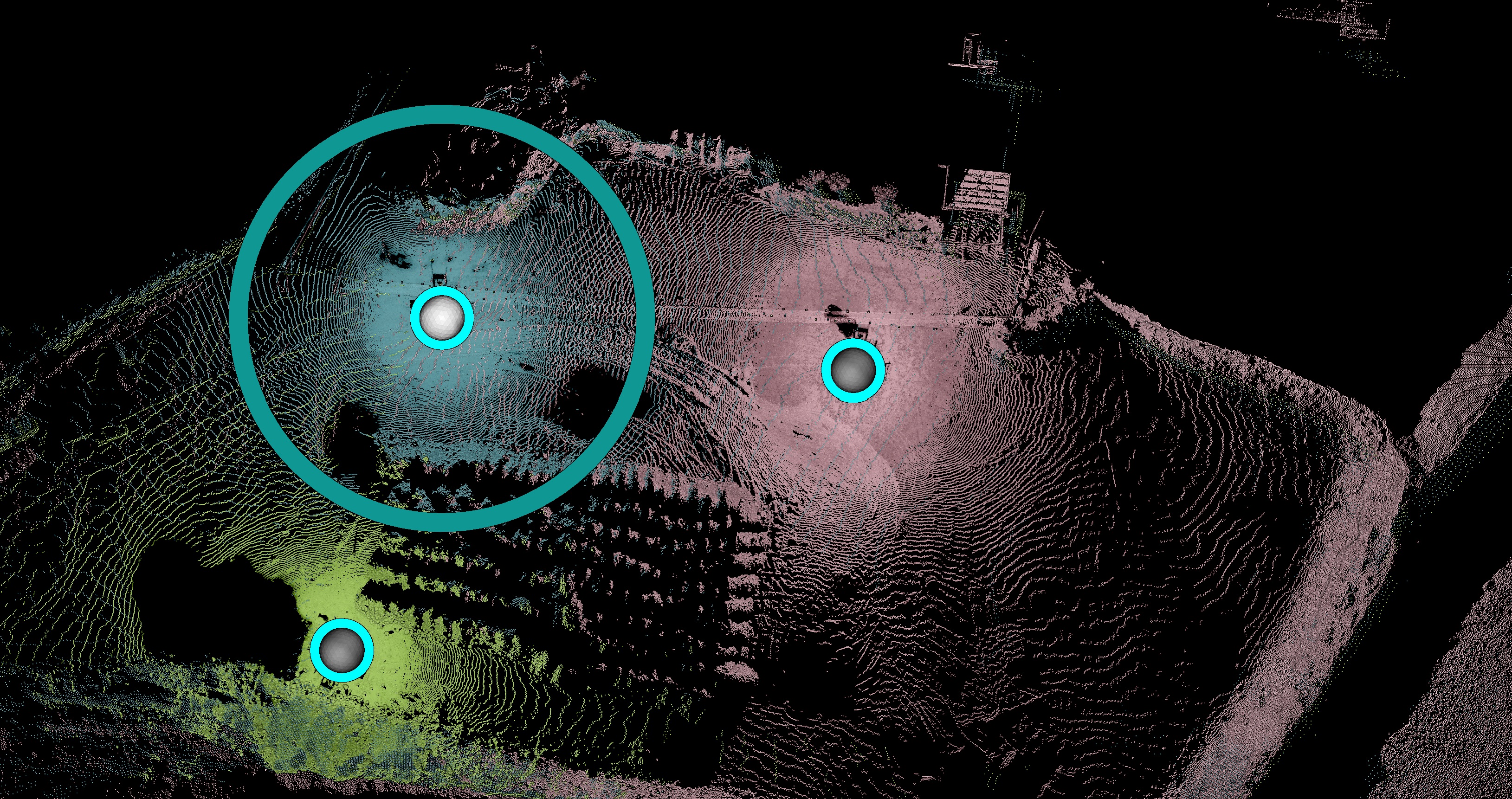 around their origins. When launched, the tool appears as a white sphere inside a cyan ring at the origin of each selected scan. That is, there will be as many instances of the tool as selected scans. Only one instance will be active at any moment. The active tool will also have a larger outer ring in the x-y plane of the corresponding scan. The outer ring is the rotation handle.