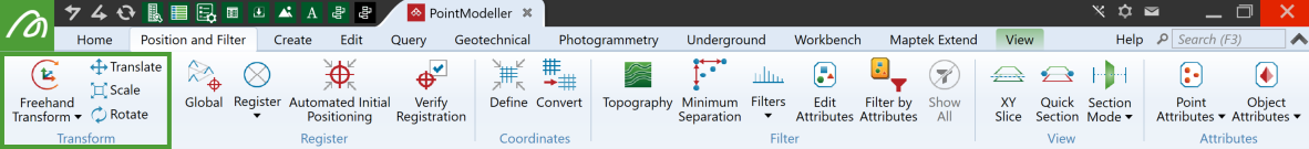 The Transform group (Position and Filter tab) contains tools for repositioning and resizing objects in the view window.