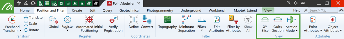 The View group on the Position and Filter tab contains sectioning tools that can assist with positioning and filtering data by enabling you to check scan alignments to confirm correct registration.