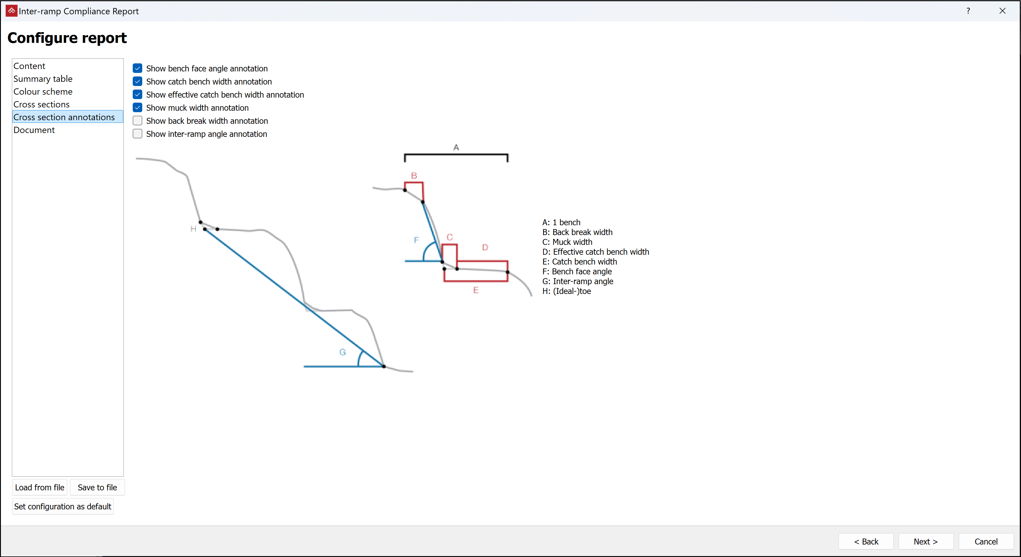 • Cross section annotations: Select the cross section annotations required for the report and clear those not required.