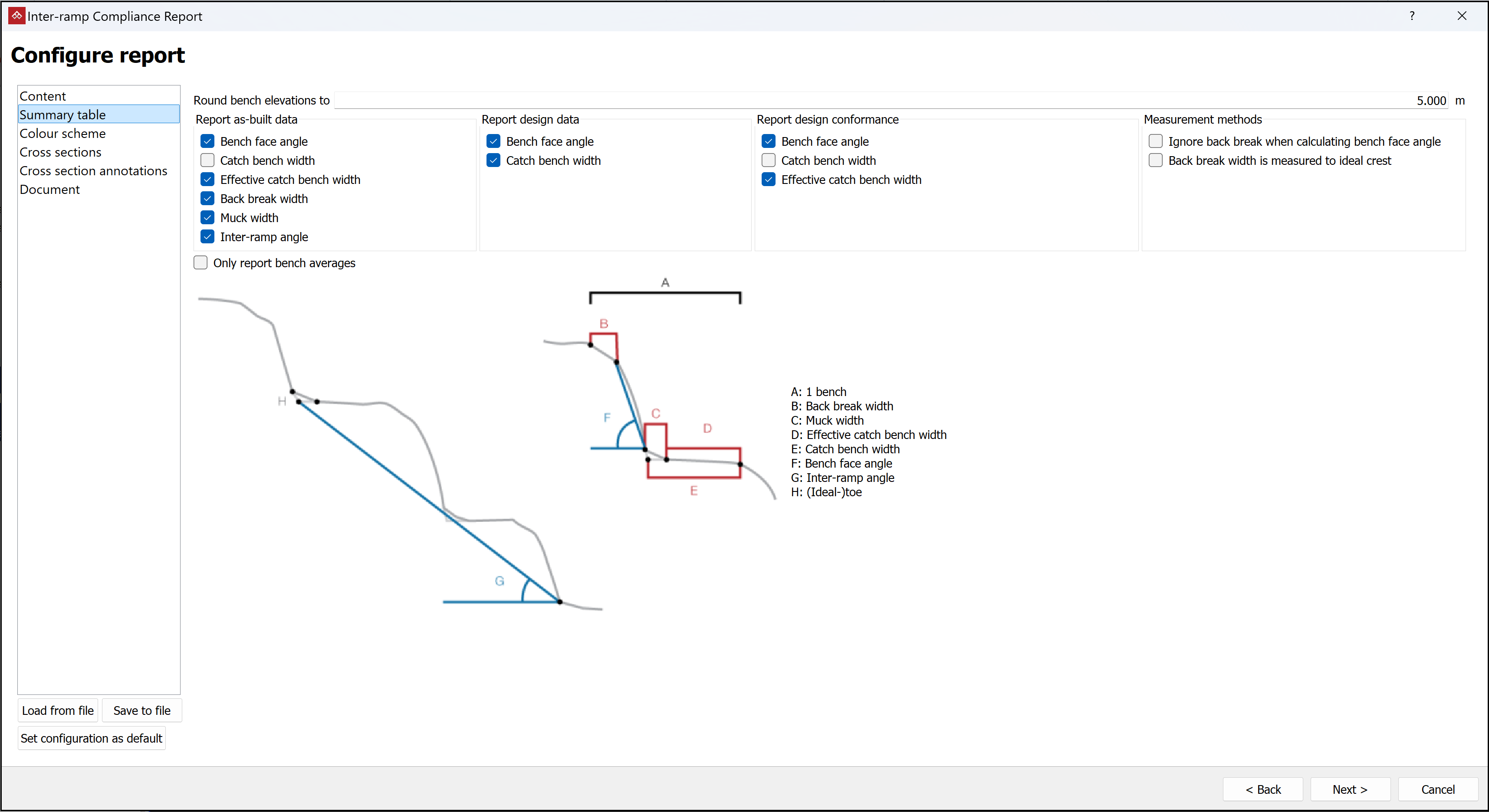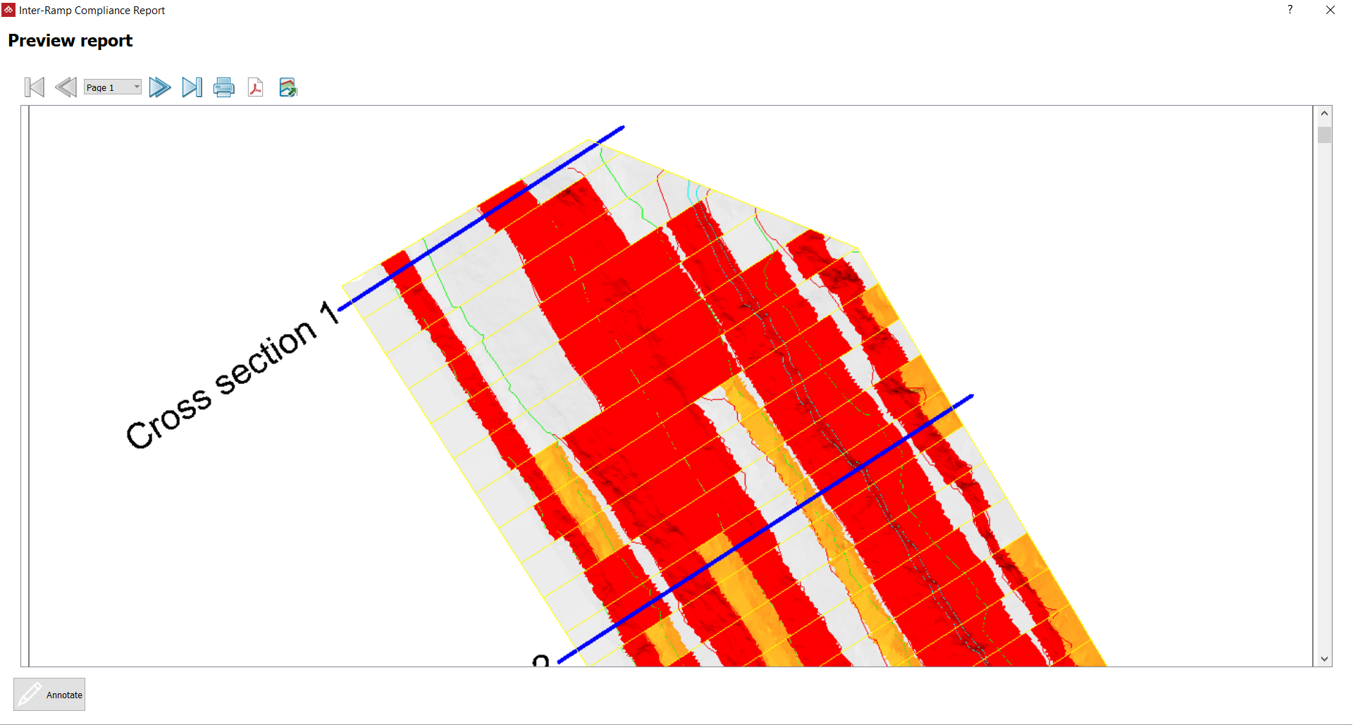 The Inter-Ramp Compliance reporting tool (Query tab > Reporting group) enables you to analyse bench face angles and catch bench widths, then generate reports detailing the compliance with site specific tolerances.