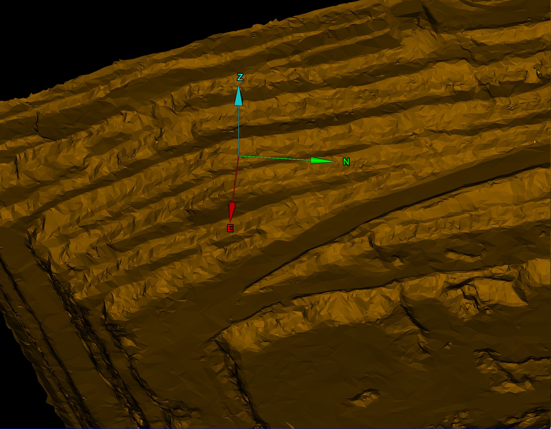 The IRC reporting tool also creates a set of output objects in a secondary container (in the scrapbook container) named for the boundary polygon. This container will be referred to below as the output container. You can choose not to generate some of these objects, as explained under Content in step 5, below. You can view these output objects in PointModeller for further inspection. Using the results, you can identify areas of concern in wall angles and catch bench widths for stability, rock fall, and design optimisation.
