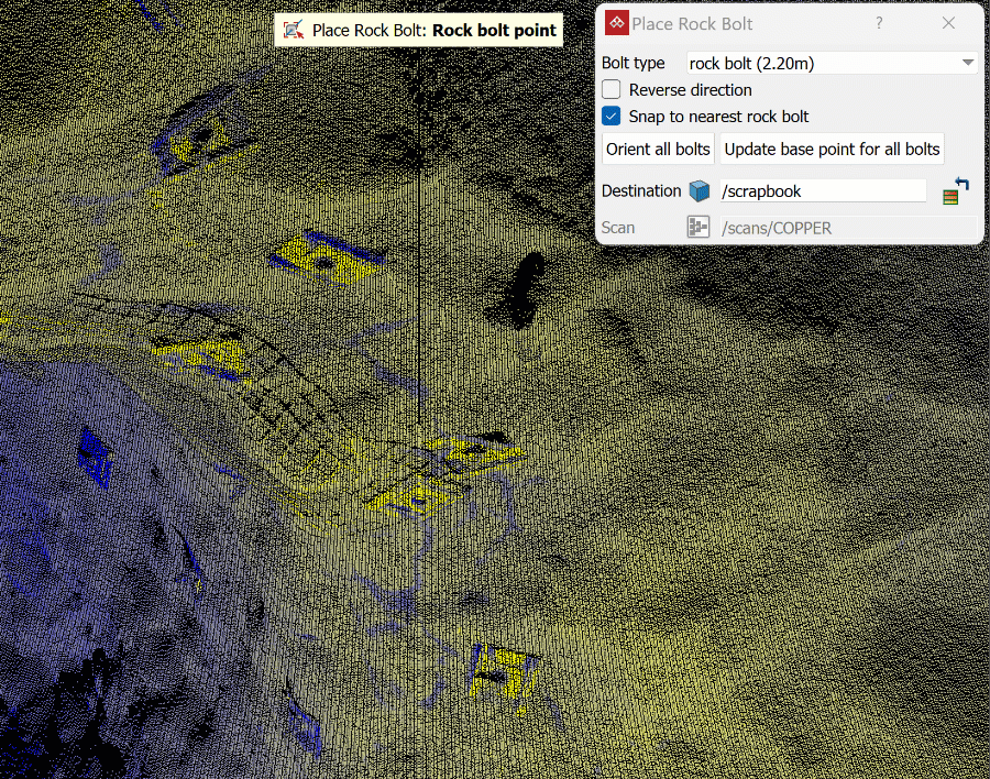 Initially the new rock bolt will be coloured orange and will follow the mouse around the scan.