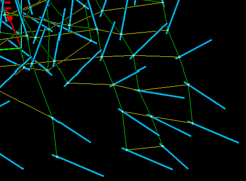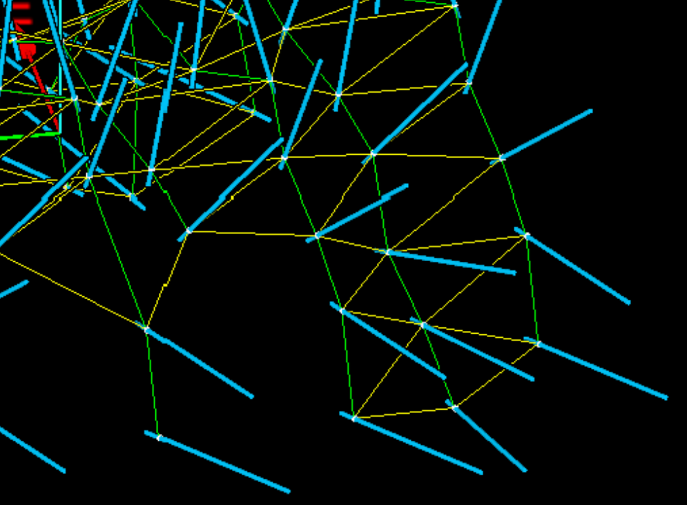 In the above example the different colours represent a rock bolt in place (blue), a split set bolt in place (brown), and a cable bolt in place (purple). |