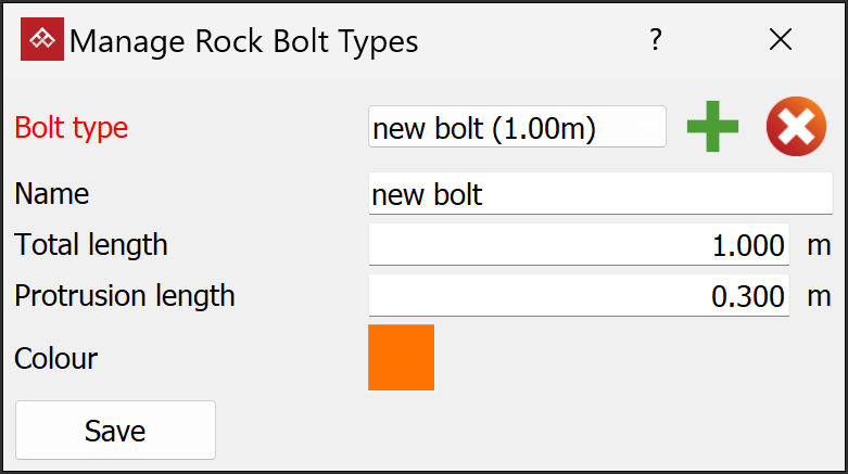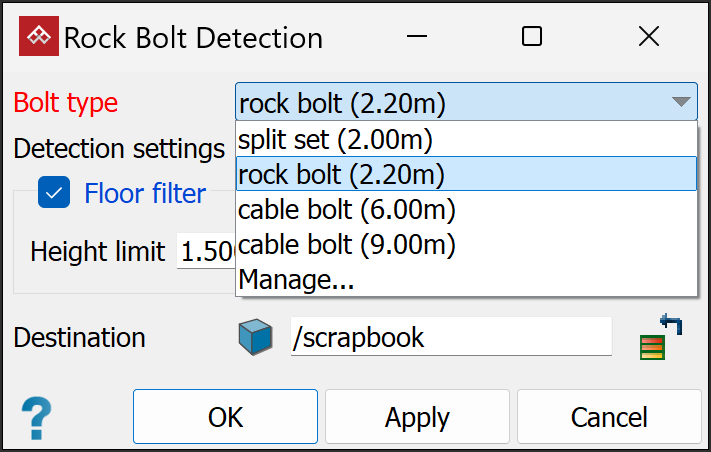 If a bolt type is not available in the drop-down list, you can create it using the rock bolt type manager tool. To create a custom bolt, select Manage... from the Bolt type drop-down list of the rock bolt detection tool.