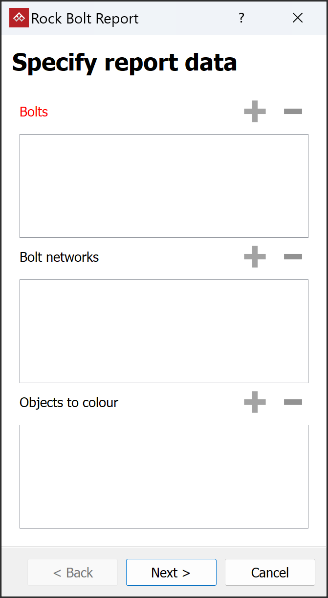 To add items to the list, select individual rock bolts or containers of rock bolts in the project explorer, and click the