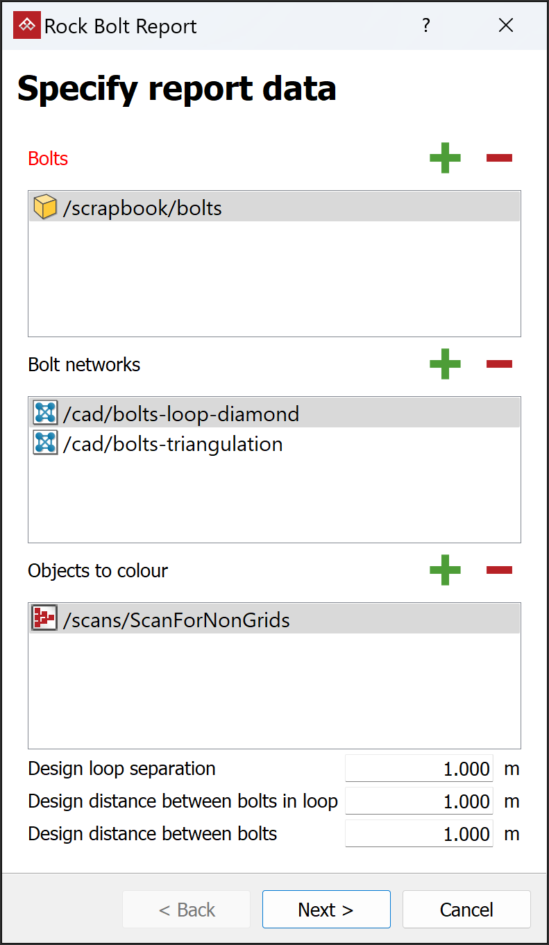 button. Alternatively, drag and drop a selection of rock bolts from the project explorer into the list. -