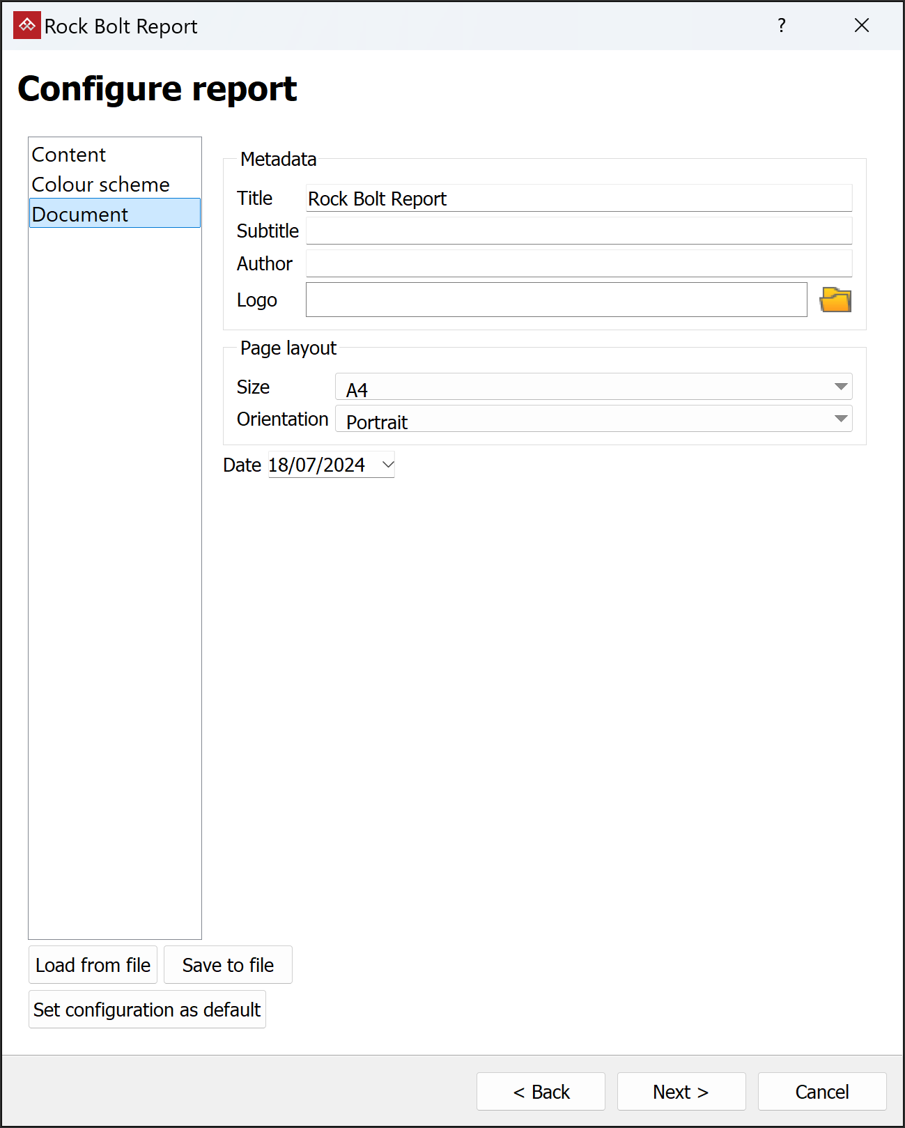 Note: You can save and recall report configurations to save time for future reports. Use the Load from file, Save to file and Set configuration as default buttons as required.
