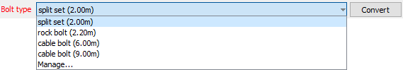 Choose a Bolt type to place, or select Manage... from the bottom of the list to create custom rock bolts (see Creating a custom bolt).