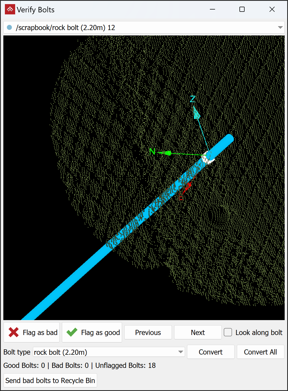 The Verify Bolts window will open and display a small section of the scan surrounding the rock bolt to analyse more closely.