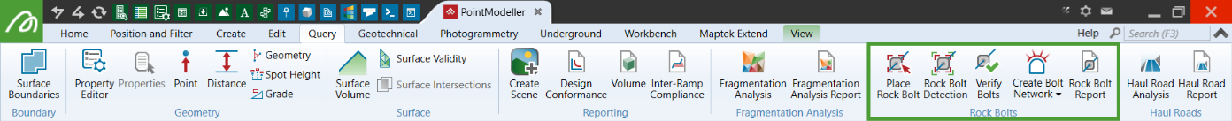 The Rock Bolts group tools on the Query tab enable you to prepare and review rock bolt plans and generate reports.