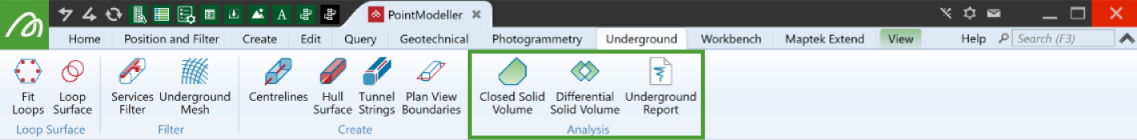 2. On the Underground tab, in the Analysis group, select Closed Solid Volume.