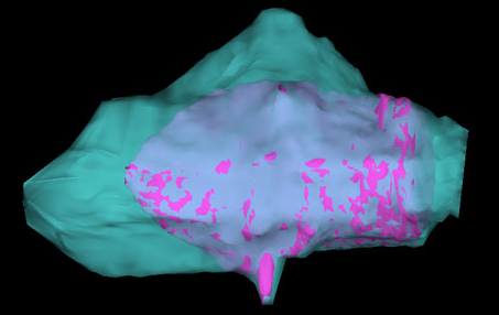 The pink shaded areas indicate what has been excavated against the design stope (light blue).