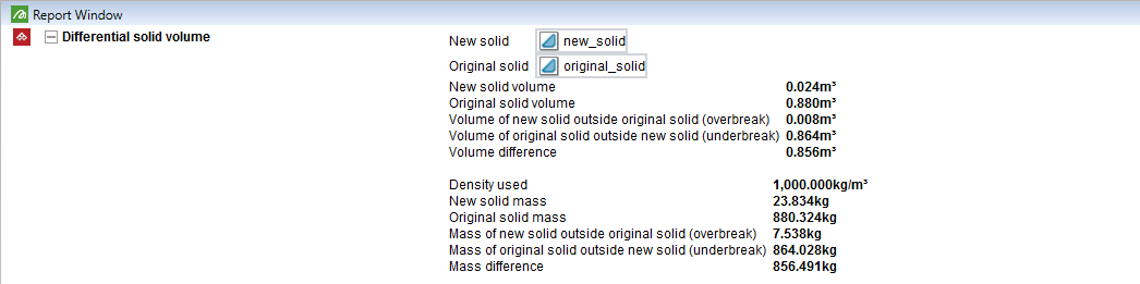 Both surfaces are checked for inconsistencies and the volume of each solid is calculated. Results appear in the report window, in terms of volume and mass differences, and the areas of overbreak and underbreak.